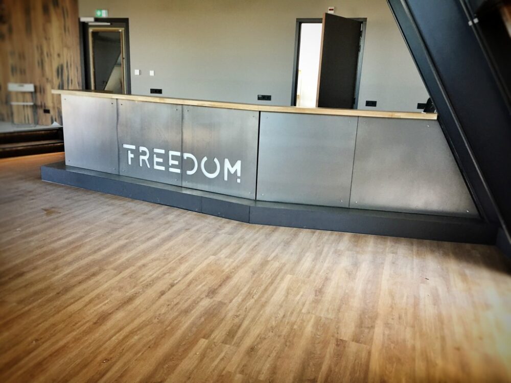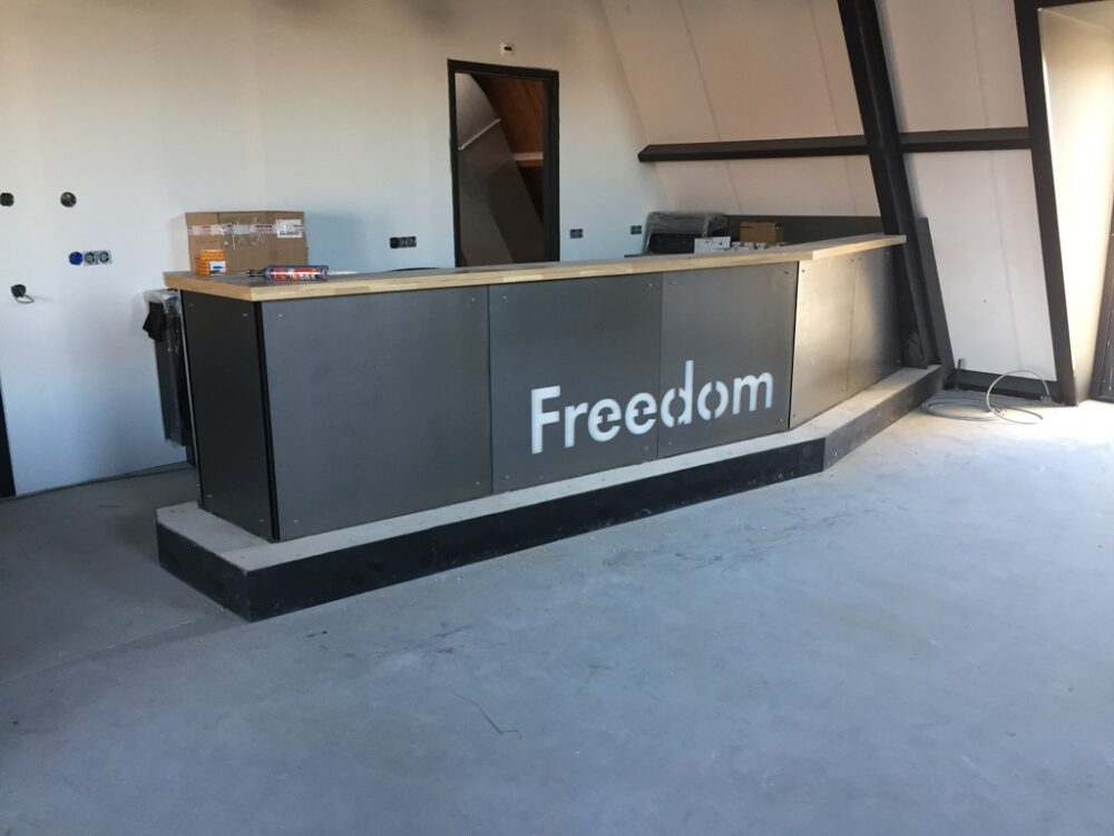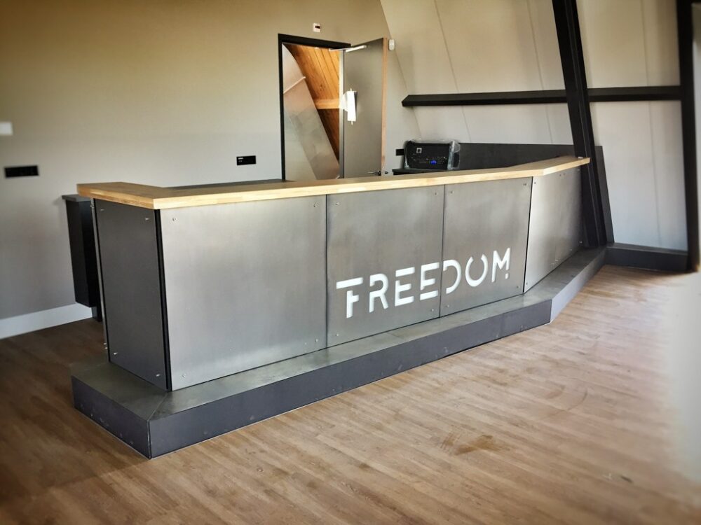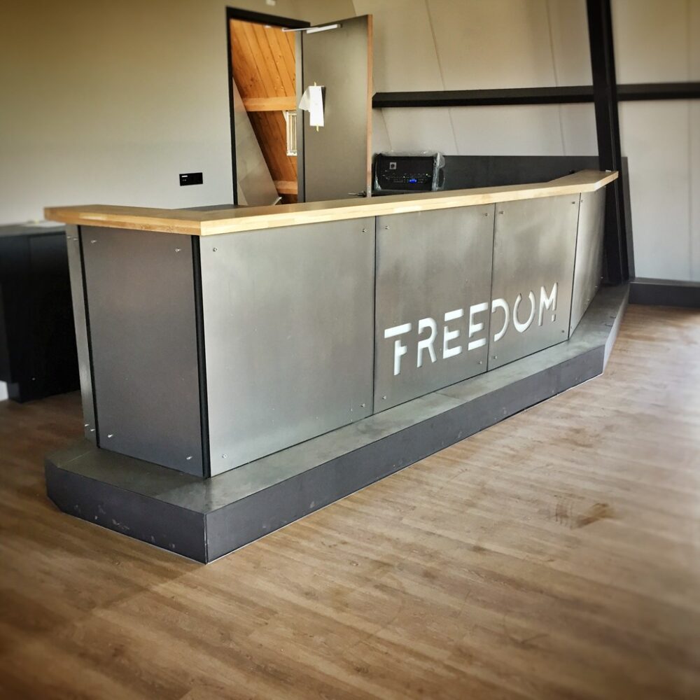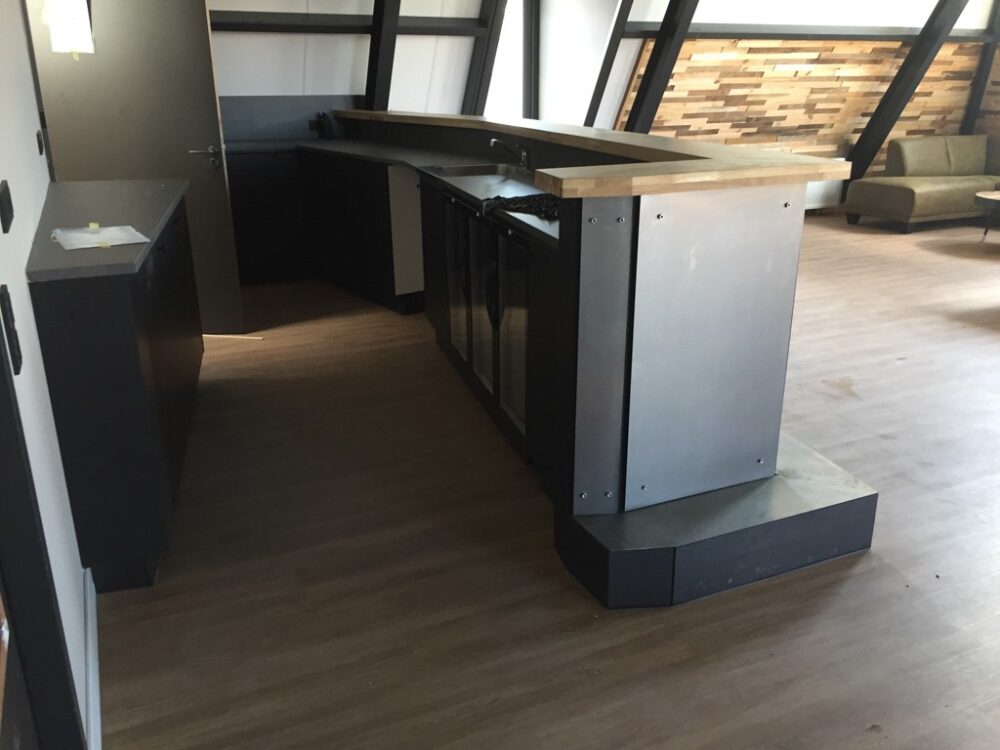 We hebben de bar ontworpen met een geknikte vorm die de bar is slanker maakt terwijl er toch vrij veel ruimte achter de bar is. In de bar zijn o.a. een koelkast, vaatwasser en audio-apparatuur verwerkt. De bar is van binnen gemaakt uit mat zwarte materialen als basis en de accenten van staal (roestkleurig) en massief eiken.