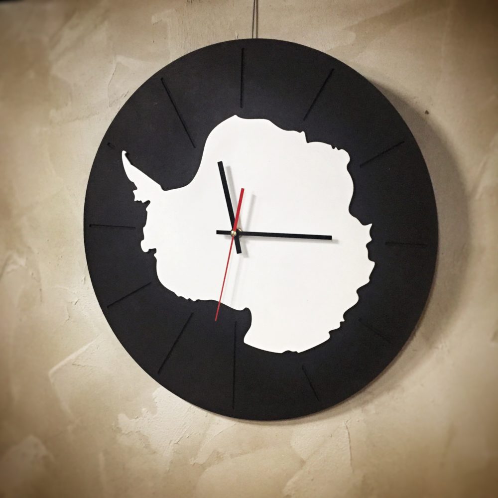 Dit vormt de inspiratiebron voor deze klok. De omtrek van Antartica veranderd met de tijd, en dit is de vorm van de zomer 2020. Daarmee een visuele prikkel om de zuidpool te behouden voor wat zij nu is.