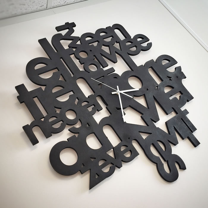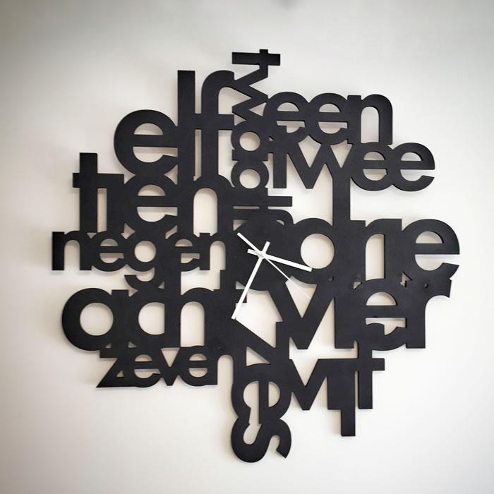 Een andere kijk op tijd! Deze klok is samengesteld uit de cijferwoorden die samen de klok vormen.